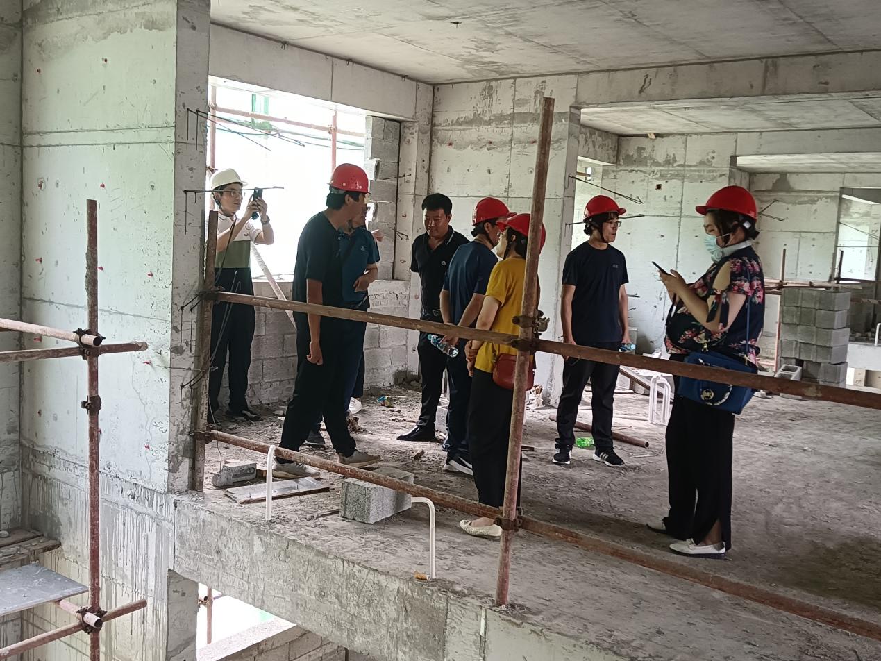 为加深学生对项目现场施工情况的理解,教师团队到达第四个目的地,碧桂园·国风盛璟。通过镜头,同学们对现场户型的内部结构及工地的样板间进行了参观,卫生间有预留的水管及排气道,排气管道基本都是预制的。通过现场技术人员的介绍,可了解到该工程项目的要点主要有土建完成移交面施工工艺:内墙挂网、两遍腻子、清水石膏,保证不开裂降低后期质量隐患;现场使用加压混凝土砌块,优点质量轻、隔音;整栋楼的每一户都安装有新风系统,预留新风系统通风孔。