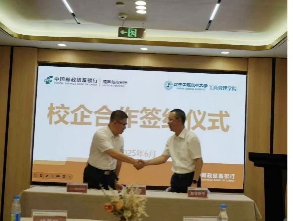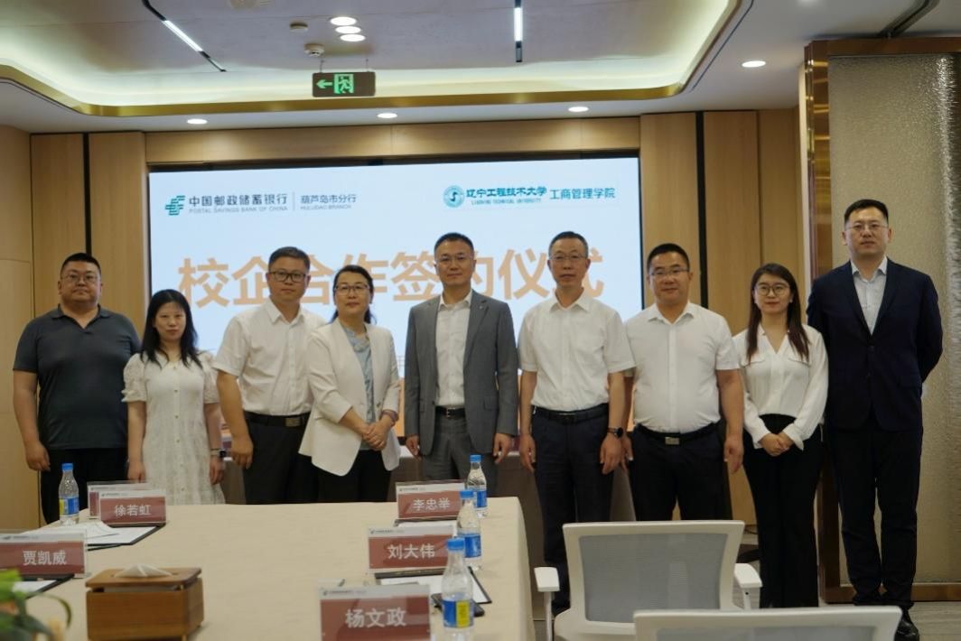 (通讯员 李伯华)2025年6月5日,工商管理学院与中国邮政储蓄银行葫芦岛市分行成功举办应用经济学人才联合培养基地签约仪式。工商管理学院党委书记徐若虹、副院长贾凯威、金融系主任李伯华、教师吴津津与邮储银行葫芦岛市分行行长李忠举、副行长刘大伟、总经理杨文政、副总经理张亚宾共同参加,会议由城区支行副行长宋烨(金融学专业09届毕业生)主持。