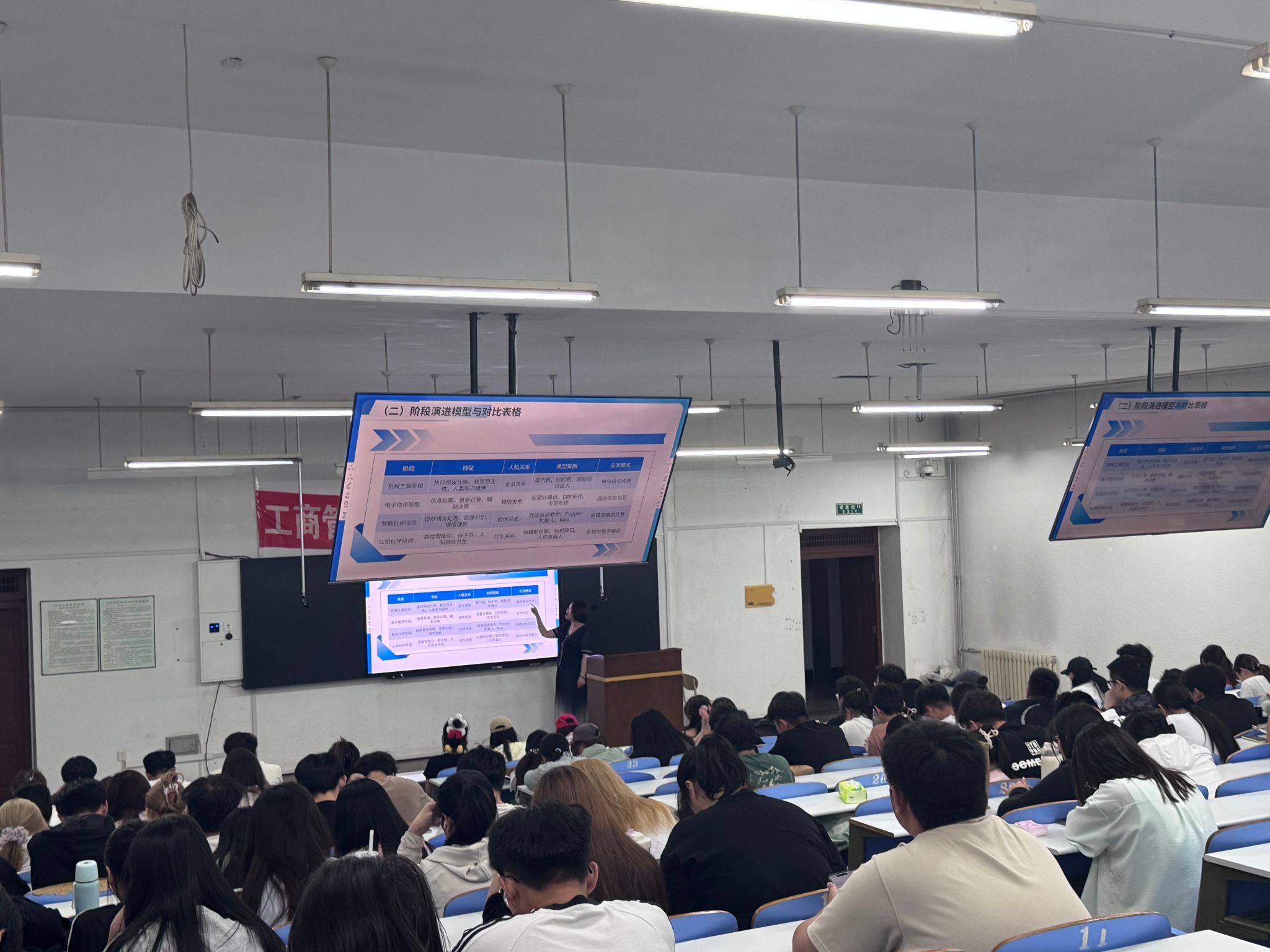 本次讲座由工商管理学院牛莉霞教授主讲。本次讲座以人机关系的历史脉络为切入点,系统梳理了从工业革命时期机器作为人类生产工具,到信息时代人机初步协作,再到智能时代人机迈向伙伴关系的演进轨迹。在理论讲解中,牛老师以瓦特改良蒸汽机推动工厂化生产、IBM深蓝战胜国际象棋大师卡斯帕罗夫、波士顿动力机器人实现复杂动作等经典案例为引,生动展现了人机关系的迭代升级,引导同学们深入思考技术发展对人类社会的深远影响。