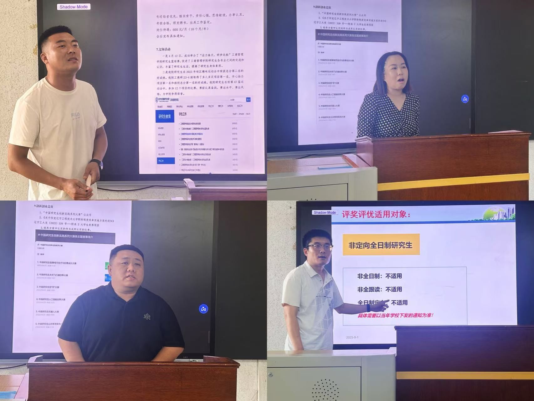会上,辅导员结合分管负责工作分别介绍了学校和学院研工部的基本情况,对研究生日常管理服务、党员发展、科技学术、文体竞赛、奖助贷补、就业服务心理健康及安全稳定等方面进行说明,对网络诈骗、交通安全、寝室防火等方面进行安全教育。