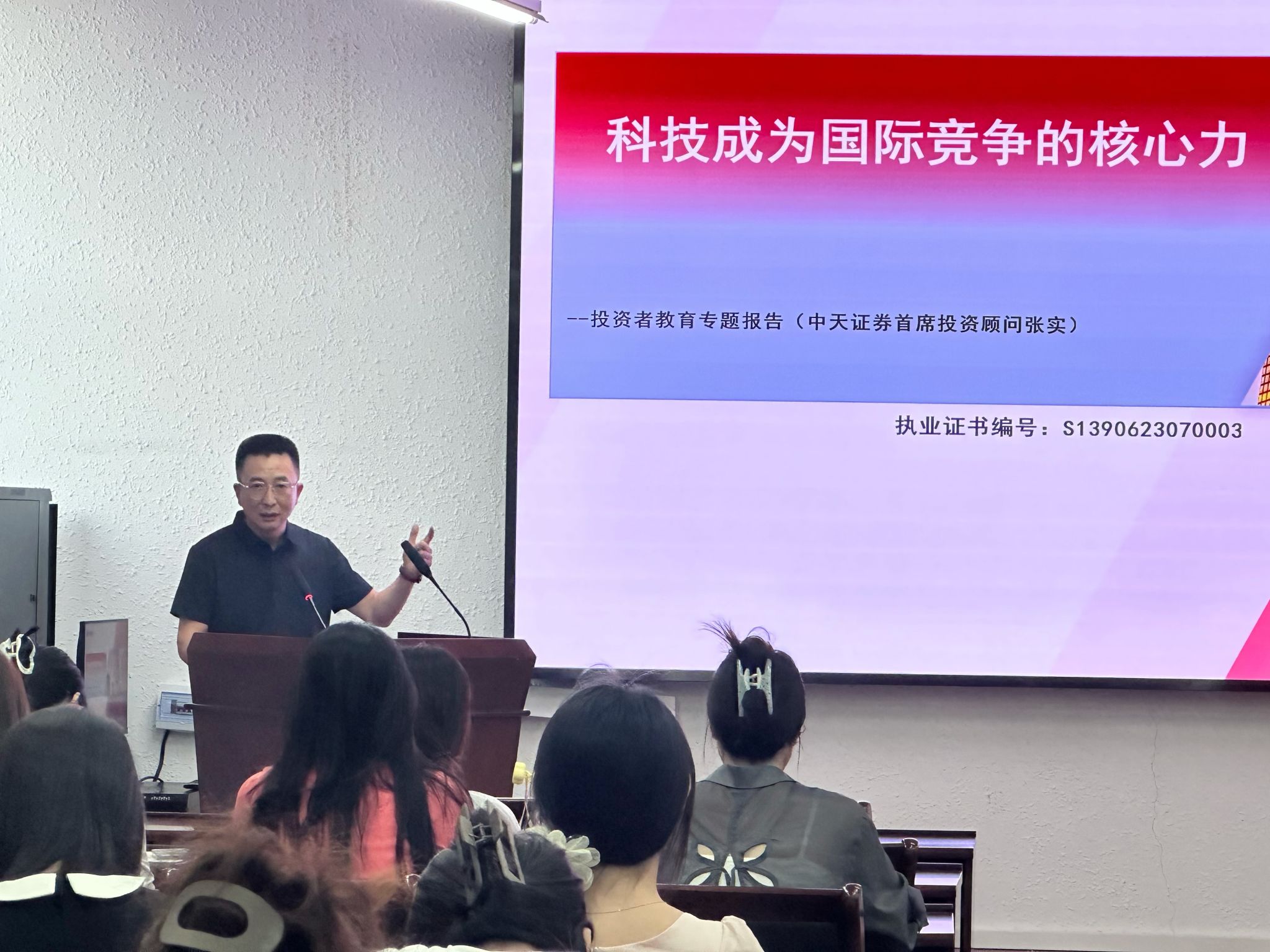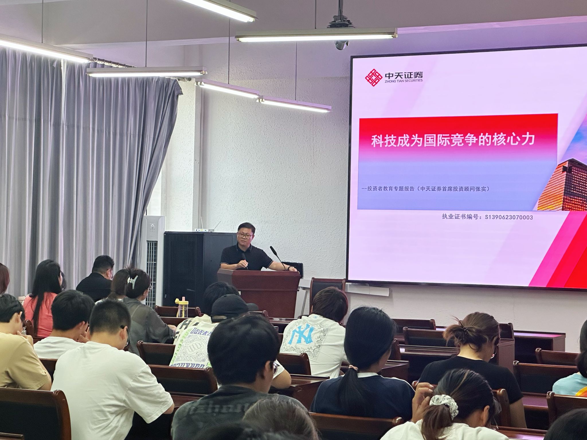 (通讯员 吴津津)2025年9月15日15:00,工商管理学院与中天证券股份有限公司共建投资者教育基地首场专题讲座在静远楼302展开,中天证券资深首席投资顾问张实为主讲嘉宾。