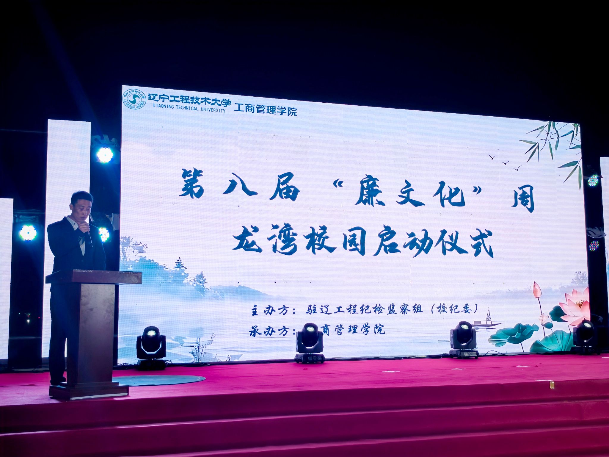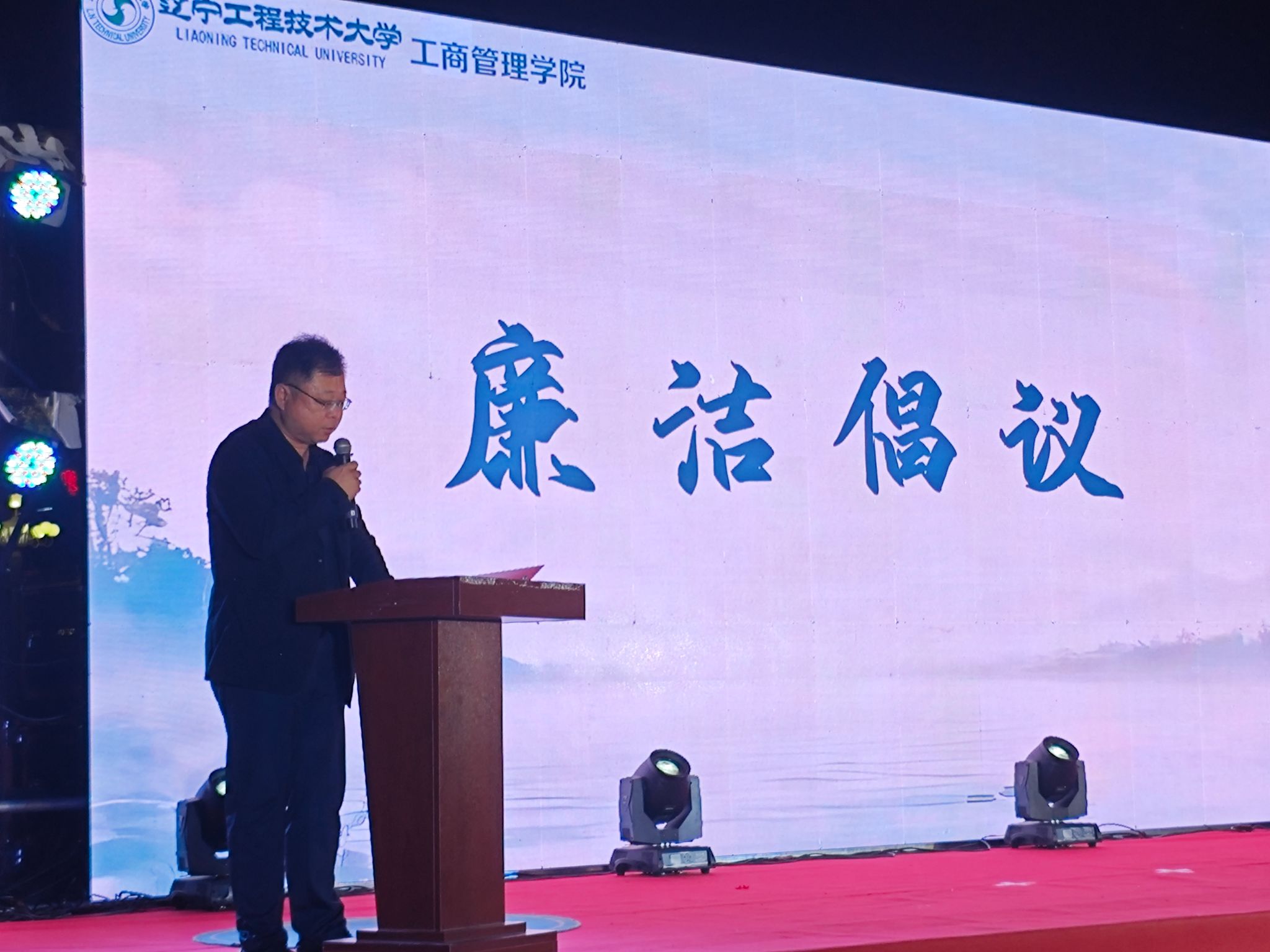 (通讯员 葛世星)9月27日晚,工商管理学院在太阳石广场举办第八届“廉文化”周龙湾校园启动仪式。辽宁省纪委监委驻辽宁工程技术大学纪检监察组副组长、校纪委副书记于国君,工商管理学院副院长(主持工作)李晓梅,正处级组织员郑玉满,学院党委副书记、纪委书记、副院长王健,副院长毛志勇、贾凯威,500余名教职工和学生代表参加了仪式。本次活动以弘扬清风正气、营造廉洁校园文化为主题,标志着为期一周的系列廉洁教育活动正式拉开帷幕。