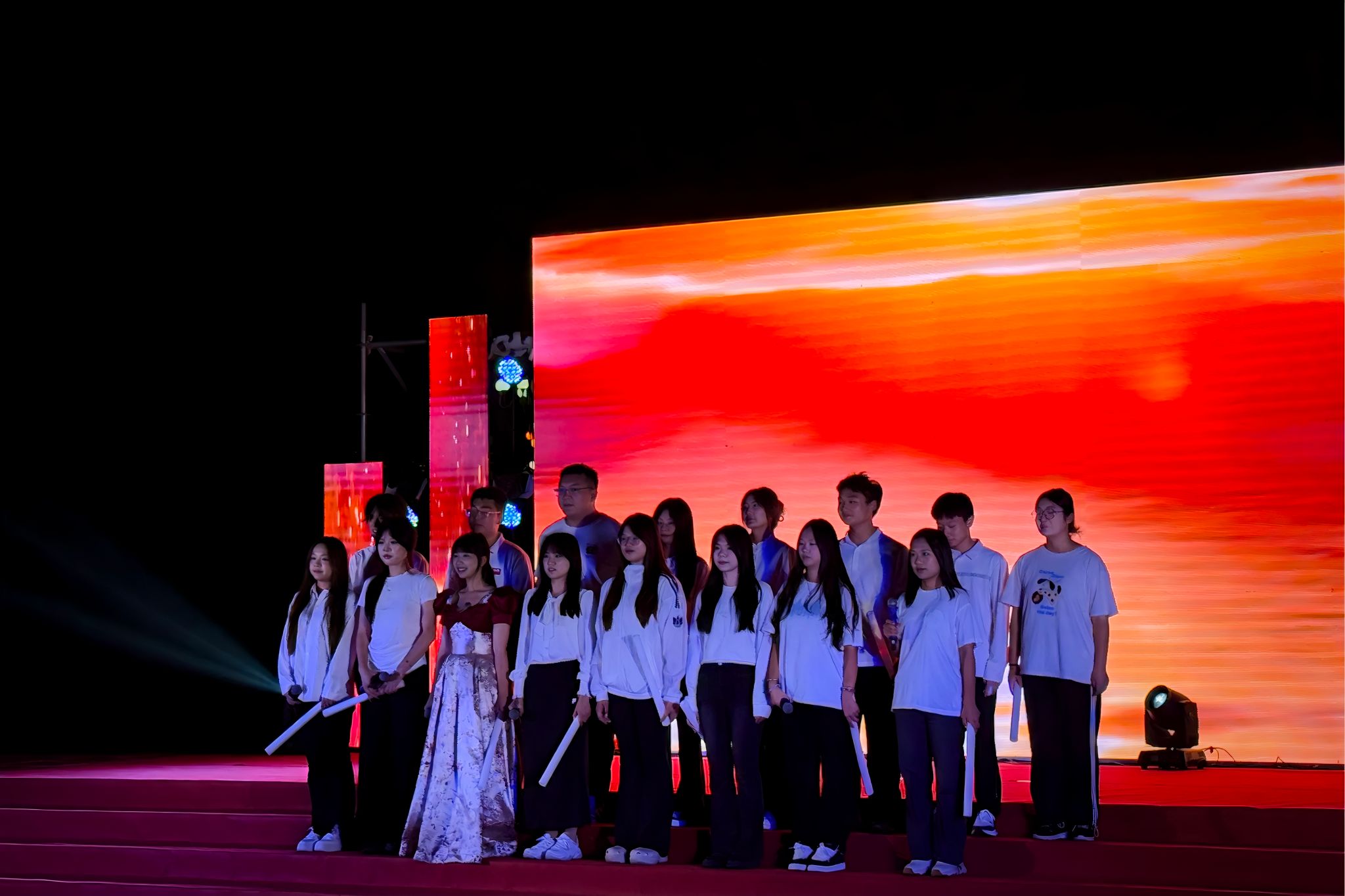 随着节奏的转变,晚会进入“燃梦”篇章,瞬间点燃全场热情。活力四射的舞蹈表演《Style》引爆掌声与欢呼,展现了学子们无限的活力与激情。2025级新生副班导师带来的歌曲《倔强》,是对所有新生的殷切期望,全场观众挥舞着荧光棒,形成一片璀璨的星海,场面温馨感人。