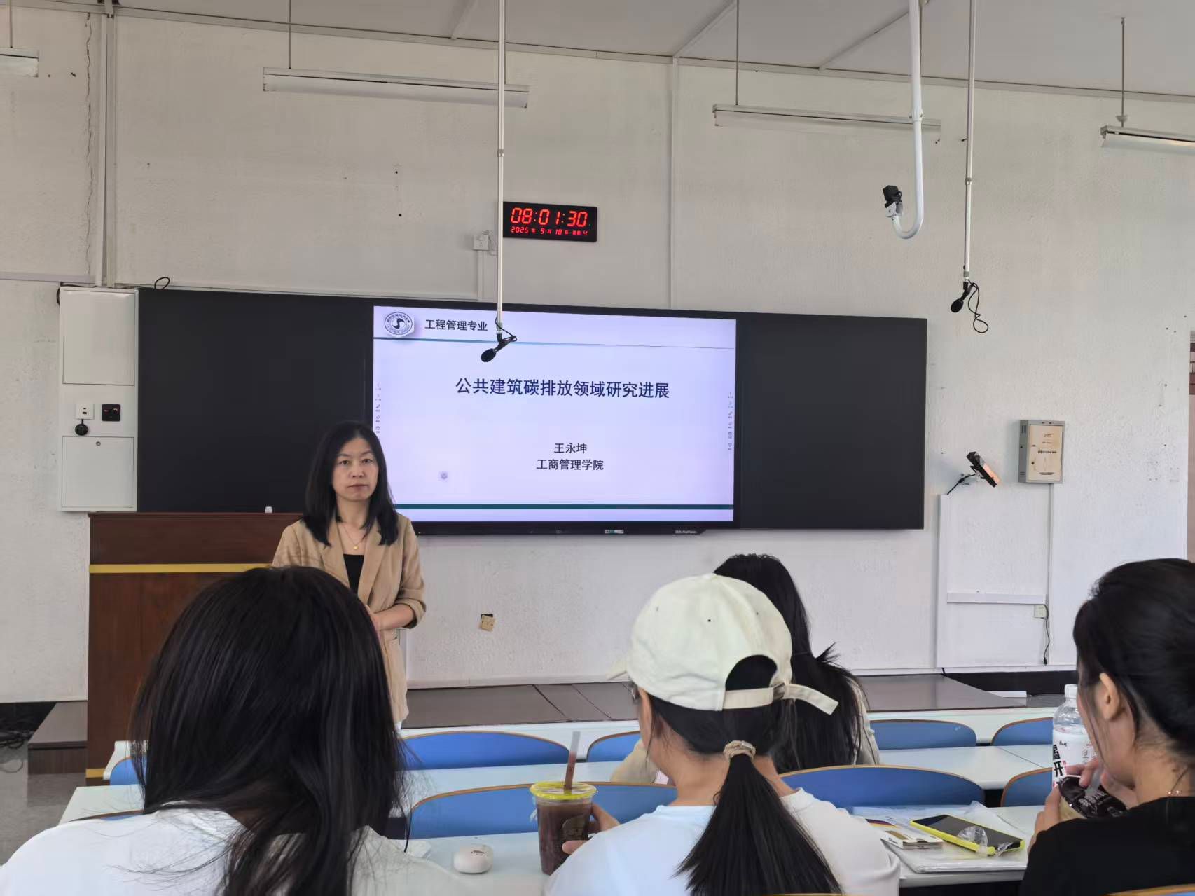 2025年9月18日下午,工程管理专业王永坤老师以“公共建筑碳排放领域相关研进展”为主题的课外科研训练讲座在耘慧楼116展开。王老师向同学们普及了二氧化碳引发温室效应的基础知识,分别向同学们介绍了建筑领域碳排放相关研究背景、建筑碳排放相关研究点、建筑行业实现“30-60”路径等。最后,王老师针对同学们感兴趣的问题进行了交流。