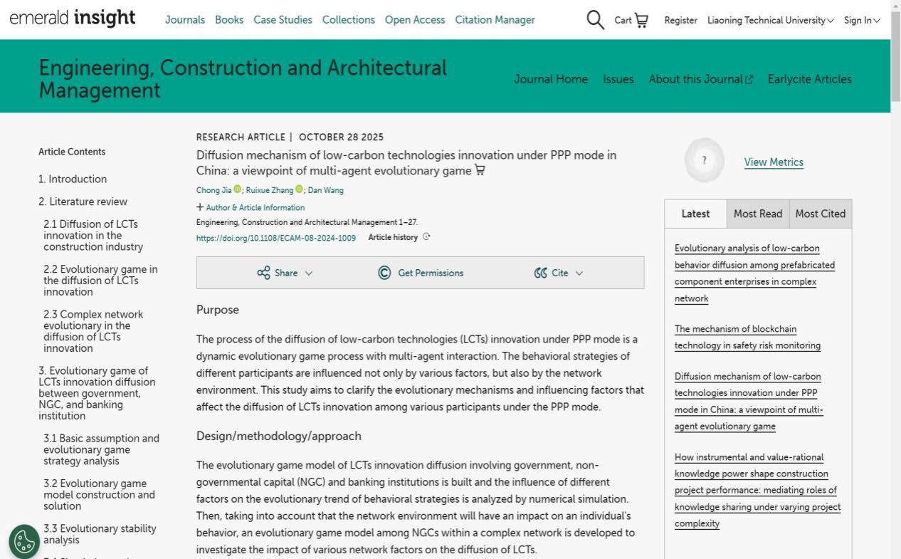 (通讯员 张瑞雪)近日,我院管理科学与工程学科“信息与工程管理”创新团队贾崇、张瑞雪、王丹老师,围绕“政府与社会资本合作(PPP)模式下多主体低碳技术创新扩散机理”这一研究方向,撰写的学术论文《Diffusion Mechanism of Low-carbon Technologies Innovation under PPP Mode in China: A Viewpoint of Multi-agent Evolutionary Game》在《Engineering, Construction and Architectural Management》期刊录用并在线发表(https://doi.org/10.1108/ECAM-08-2024-1009)。