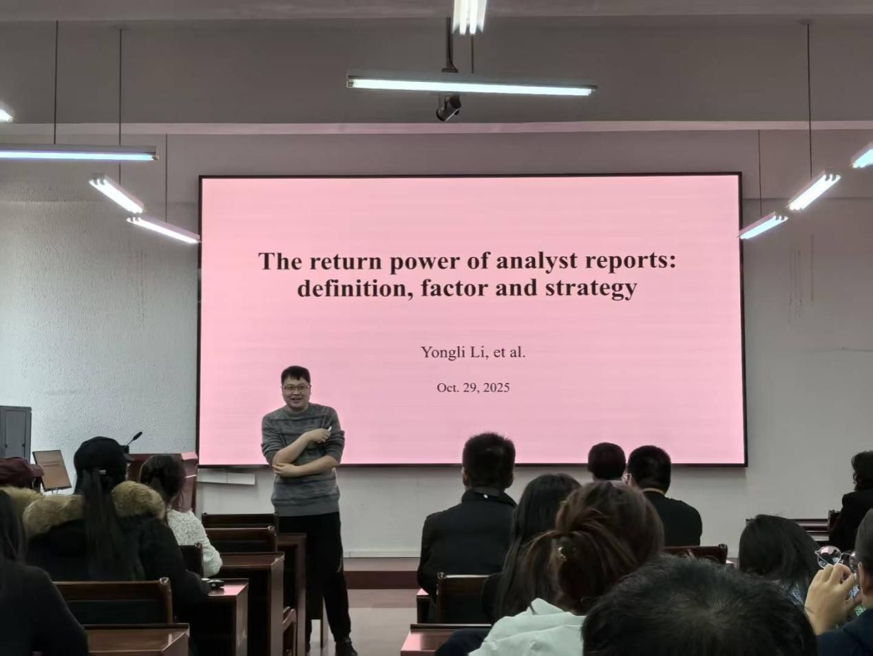 (通讯员 刘伟)10月29日,我院李永立教授在静远楼302为我院师生作题为《The Return Power of Analyst Reports: Definition, Factor and Strategy》的学术报告。学院师生共计一百五十余人参加,现场气氛热烈。