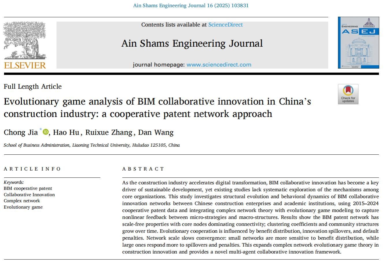 (通讯员 张瑞雪)近日,我院管理科学与工程学科“信息与工程管理”科研创新团队贾崇、张瑞雪、王丹老师及研究生胡皓,围绕“BIM技术产学研协同创新”这一研究方向,撰写的学术论文《Evolutionary game analysis of BIM collaborative innovation in China’s construction industry: a cooperative patent network approach》在《Ain Shams Engineering Journal》(ASEJ)期刊录用并在线发表(https://doi.org/10.1016/j.asej.2025.103831)。