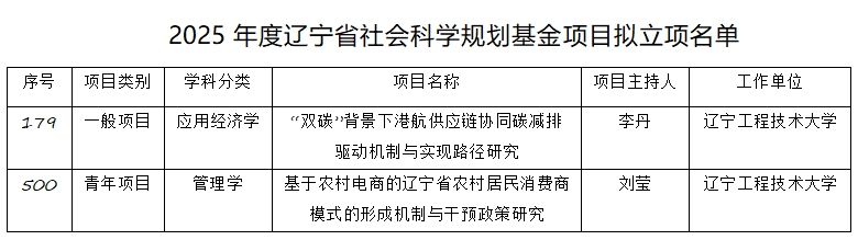 (通讯员 刘伟)近日,辽宁省社会科学规划基金办公室公布了2025年度辽宁省社会科学规划基金项目立项名单,我院两位教师申报的课题成功入选。李丹老师的““双碳”背景下港航供应链协同碳减排驱动机制与实现路径研究”获立一般项目立项;刘莹老师的“基于农村电商的辽宁省农村居民消费商模式的形成机制与干预政策研究”获青年项目立项。