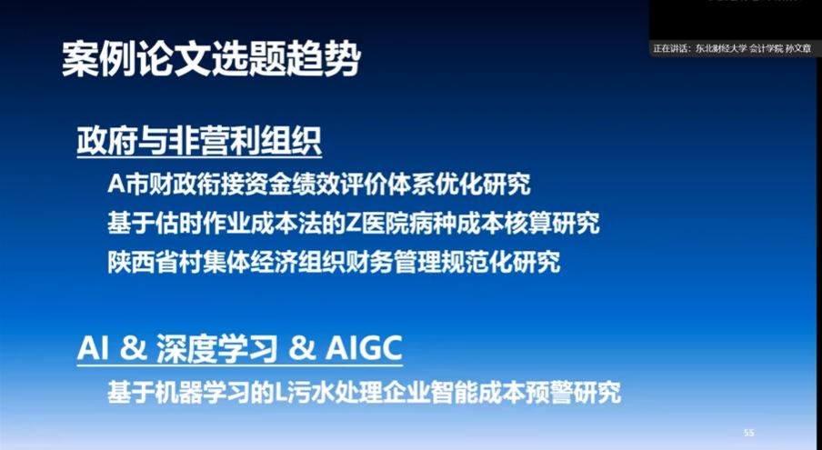 报告中,孙文章副教授以全国会计专业学位研究生教育指导委员会发布的《会计专业学位类别硕士学位论文基本要求(试行)》为核心依据,对会计专硕学位论文的写作规范与核心要求进行了体系化解读。一方面,孙文章副教授精准对标教指委最新政策导向,清晰界定了论文选题、框架搭建、内容撰写、格式规范等关键环节的核心标准,同时结合行业发展动态梳理出数字经济背景下会计专硕论文的前沿选题方向,为同学们破解 “选题难、立意浅” 的痛点提供了明确指引;另一方面,孙文章副教授分享了东北财经大学在会计专硕培养中的先进理念与实践范式,从导师指导流程到论文质量管控体系,提供了一系列可复制、可落地的实操建议,为我院进一步优化培养模式、提升导师指导效能提供了宝贵借鉴。