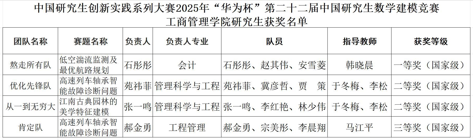 (通讯员:贺莹)近日,由教育部学位管理与研究生教育司指导,中国学位与研究生教育学会、中国科协青少年科技中心联合主办的中国研究生创新实践系列大赛2025年第二十二届中国研究生数学建模竞赛“华为杯”颁奖典礼于徐州圆满落幕。本届赛事吸引了全国631所高校及研究生培养单位共78687名研究生参与,累计提交有效作品26229项。经过严格评审,由韩晓晨老师指导,工商管理学院研究生石彤彤、赵其伟、安雪菱团队在《低空湍流监测及最优航路规划》赛题中,喜获全国一等奖!此外,我院在本届赛事中荣获国家二等奖两项、国家三等奖一项。