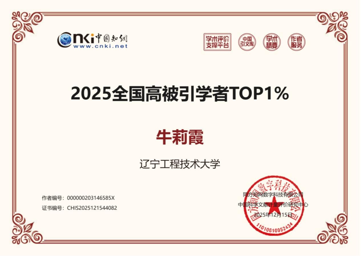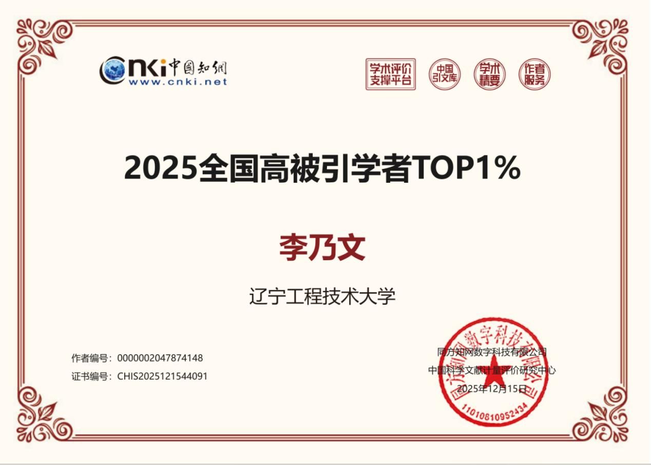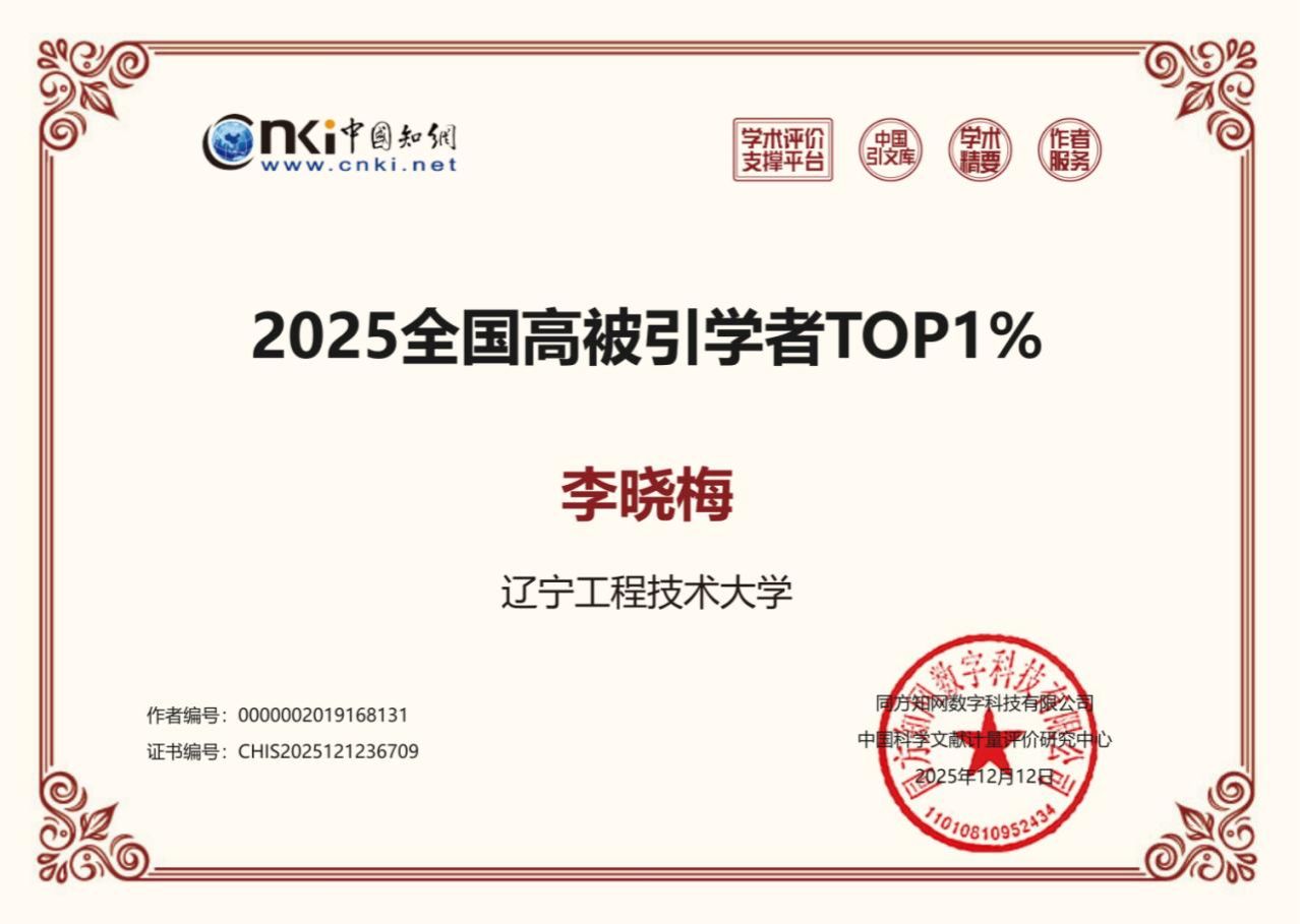 (通讯员 贾崇)2025年12月12日,中国知网下属的中国科学文献计量评价研究中心(出版智库)发布“2025全国高被引学者”榜单。本年度发布的“2025全国高被引学者”约12万人,其中TOP1%学者约3万人,TOP5%学者约9万人。辽宁工程技术大学工商管理学院共有14位老师入选,其中,李乃文、李晓梅、温廷新、王丹、牛莉霞5位老师入选全国高被引学者Top1%;李宝库、路世昌、李永立、冯东梅、郭婷婷、周玉等9位老师入选全国高被引学者Top5%。(数据来源:学术评价支撑平台)