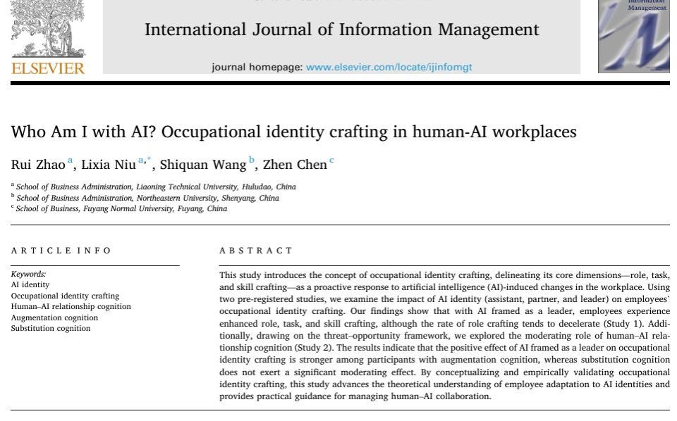 (通讯员 刘伟)我院管理科学与工程学科“智汇工学”科研创新团队牛莉霞老师和她的博士生赵蕊,围绕“人智协同”这一研究方向,撰写的学术论文 《Who Am I with AI? Occupational identity crafting in human-AI workplaces》 在 《International Journal of Information Management》(IJIM)录用并在线发表。DOI:10.1016/j.ijinfomgt.2025.102990。
